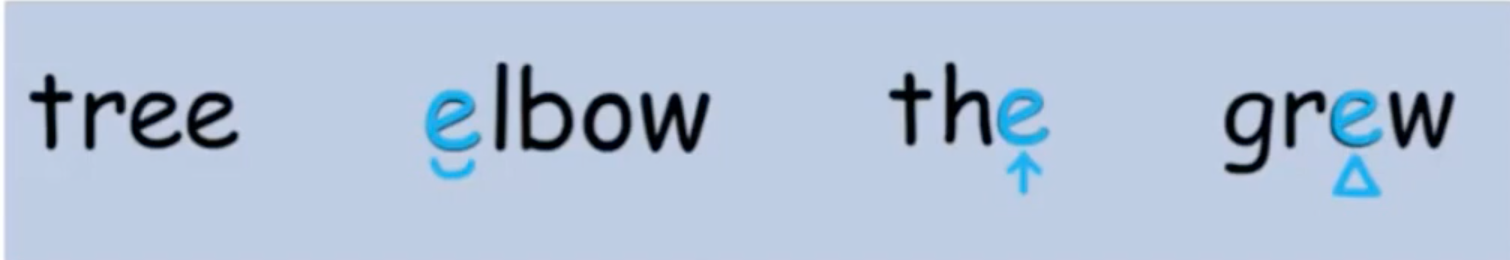 Narda: So this one is e. This is the four sounds of e and the first is e: Tree. Right. That's the main sound of e and then e has an elbow, and that's a little smile. We call that a smile symbol. Then the most common sound in the English language is often called the schwa (/ə/). We call it the up arrow and every vowel can make this sound. It’s a very common sound. Then we make ooh as in grew.