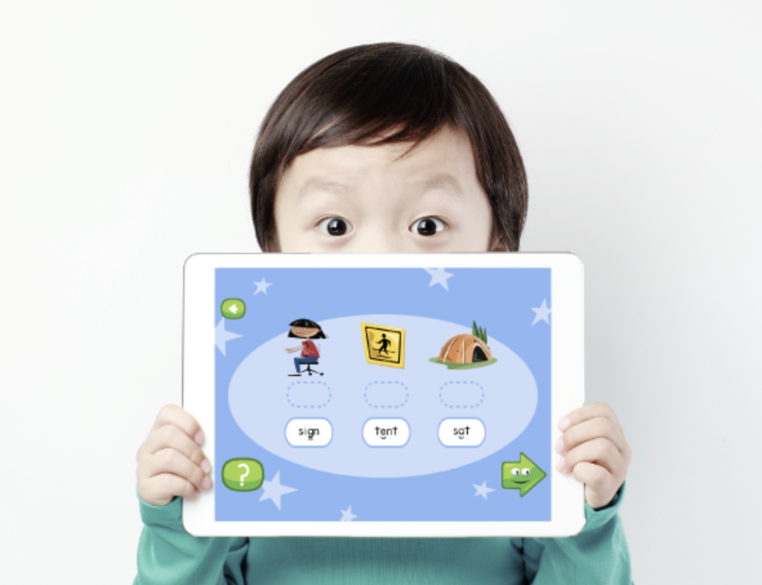 Child holding tablet showing the Nardagani reading app interface with phonics symbols and app avatar