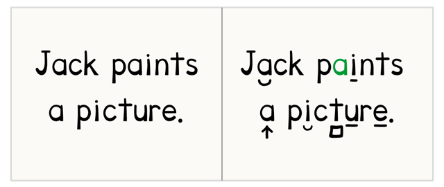 Two versions of a sentence 'Jack paints a picture.' are shown side by side